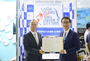 9月28日(土)には、本学ブースに愛知県立足助高等学校の上沼校長が来場され、林学部長とともに連携協定の締結式をおこないました。この連携協定は、2026年に観光に特化したカリキュラムを開始する本学部と同じく、2026年に「観光科」を新設する足助高等学校が協力し、観光ビジネスや地域振興に貢献できる人材育成をめざすものです。締結後には「ともに頑張りましょう」と励まし合い、今後の連携に期待が寄せられました。