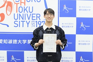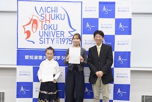 厳正な審査の結果、朗読部門とスピーチ部門それぞれに努力賞、二等賞、一等賞が発表されました。朗読部門の一等賞は、交流文化学部1年の水谷舞依さんと愛知県立豊田東高等学校2年の市川陽菜乃さん。スピーチ部門は3名で、「違いを尊重し協調を図る」をテーマに発表した交流文化学部3年の塩谷彰大さん、「最も忘れられない出来事」を披露した名古屋市立富士見台小学校4年の竹内結依さん、「忘れがたい上海・江蘇省訪問の思い出」を語った滝高等学校1年の松谷治宏さんが受賞しました。賞状と記念品の授与では、会場から盛大な拍手が送られました。