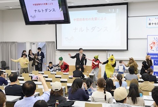 全員の発表後、審査を待つ間には「先輩による中国語学習体験談」と題し、進行役を務めた交流文化学部ランゲージ専攻4年生2名が登壇。自身の留学体験や就職活動について語り、学生たちにエールを送りました。続いて、中国語履修学生によるナルトダンスのパフォーマンスも披露され、観客席の学生も一緒に踊り、会場は楽しい雰囲気に包まれました。