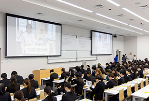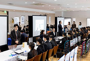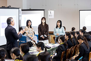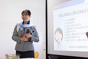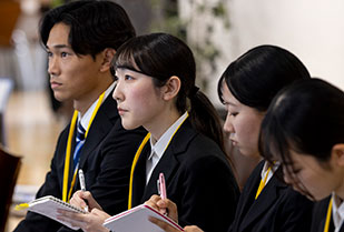 一通りの説明が終わると、卒業生への質疑応答タイムもあり、「なぜこの会社を選んだのか」「学生時代の学びで就職後に役立ったこと」「仕事のやりがい」「入社後のギャップ」など、学生たちは知りたかった本音を積極的に質問していました。卒業生の方々もそんな後輩たちの姿勢に応えるかのように自身の経験を踏まえ、社会でのリアルな働き方や就職活動を進めるうえでのアドバイスやモチベーションの保ち方などを後輩たちへ伝えていました。