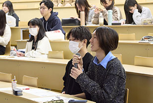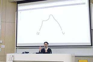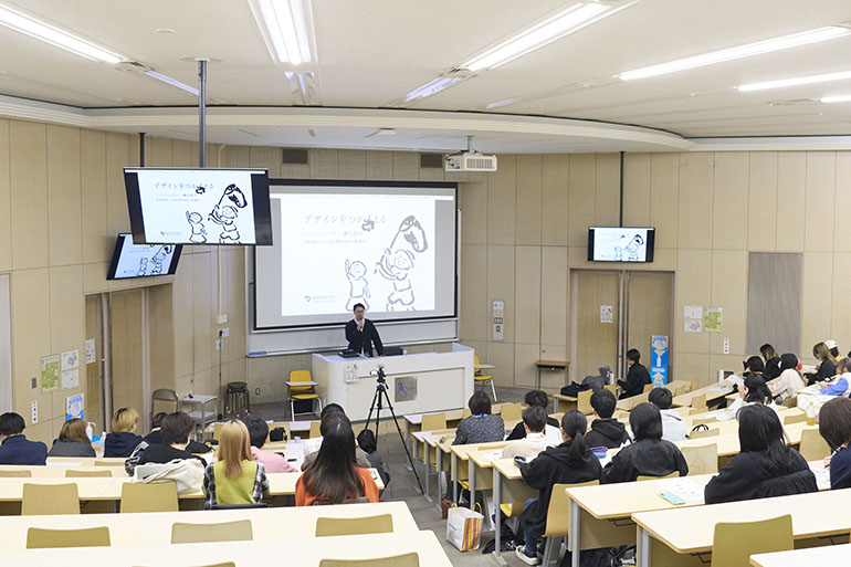 質疑応答では、学生から「鎌田さんのデザインには、ひらがなや曲線を意識的に使っているのでしょうか」と質問があり、「日本語を大事にすると、曲線やひらがなが多くなります」と、答えていただきました。