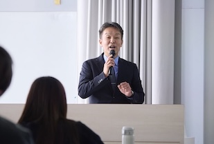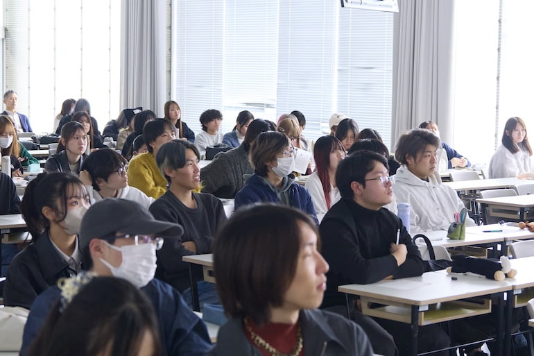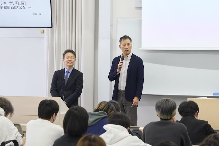 2025年11月13日(木)・20日(木)、創造表現学部メディアプロデュース専攻の藤田良治先生が担当する授業「ジャーナリズム論」において、2週にわたりゲストスピーカーを迎えた特別講義がおこなわれました。お招きしたのは、ファイナンシャルプランナーの伊藤靖様です。伊藤様は以前、JICAのプロジェクトでアフリカを訪れた際に現地で藤田先生と出会ったことがきっかけで交流が続いており、そのご縁から今回ご登壇いただきました。