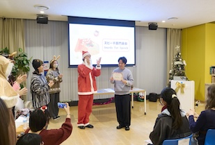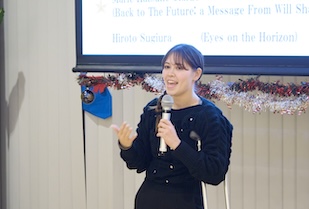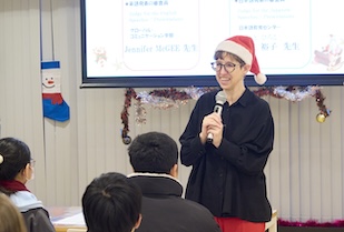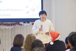 当日は学生有志が運営を担当しました。会場にはクリスマス装飾が施され、サンタクロースに扮した学生が司会を務めるなど、賑やかな雰囲気の中でスタートしました。スピーチとプレゼンテーションのテーマは、「A Story=あなた自身の言葉で、あなた自身の物語を語ろう」です。