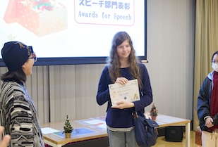 審査結果を待つ間は、運営メンバーが主体となり、参加者みんなで自己紹介やジェスチャーゲームで交流を図りました。そしていよいよ、審査結果の発表です。スピーチ部門1位に輝いたのは、Wei Yingyangさん。「留学のきっかけ」と題し、家族の反対にめげず努力し、日本留学を果たした体験をスピーチしました。2位はドイツに伝わる伝説を祖父との思い出が詰まったストーリーとして紹介したLeisner Annaさん、3位はシェイクスピアの戯曲「ハムレット」に出てくる名言を紹介しながらスピーチをしたClarke Marie Hatsuneさんでした。