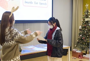 クリスマスを前にした2025年12月18日(木)、星が丘キャンパス グローバルラウンジにて、「日本語&英語スピーチコンテスト」が開催されました。交流文化学部 ランゲージ専攻の学生をメインとした英語を学ぶ日本人学生と、本学で学ぶ外国人留学生が参加し、交流を深めながらスピーチやプレゼンテーションをするイベントで、昨年に続いて2回目の開催となります。