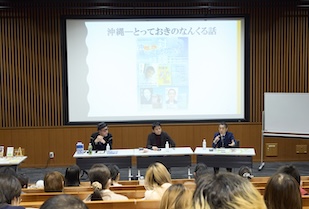 創造表現学部の授業を兼ねた講演会「沖縄 とっておきのなんくる話」が、2025年12月4日(木)に開催されました。当日は、作家で沖縄大学客員教授の仲村清司様、ノンフィクションライターで本学非常勤講師の藤井誠二先生をお招きし、柳井貴士先生が司会を務めながら、沖縄について語り合う会となりました。3名はいずれも沖縄文学の研究者であり、仲村様は大阪市生まれの沖縄人二世で、『本音の沖縄問題』『島猫と歩く那覇スージぐゎー』など多数の著書があります。