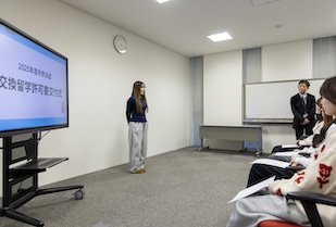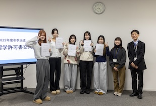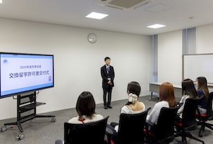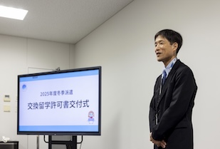 本学では、海外の大学と締結した交流協定に基づき、交換留学生の海外派遣を実施しています。2025年度の冬季派遣では、学内選考を通過した5名が交換留学生に認定されました。2025年12月5日(金)には派遣予定学生を対象とした許可証交付式が執りおこなわれました。