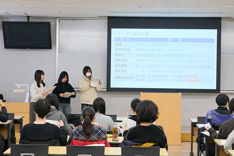 2026年1月9日(金)に行われた「企業分析プロジェクトA」の最終報告会では、学生が3〜4人の7チームに分かれ、ユタカフーズ株式会社様の分析結果をプレゼンテーションしました。最初のチームは「ユタカフーズの概要」を発表。海外投資家向けに企業概要を示す「英文・会社四季報」での紹介文や同社の中期経営計画などを参考に、同社の特徴やリスク要因を分析しました。次のチームは「ユタカフーズの人的側面」を分析。人員・人的生産性の推移、人材に対する方針、女性活躍の状況などから現状を紐解き、就活生の視点でどのような学生の就職先の選択肢となるのかについてもまとめました。3つ目のチームは「新工場の建設」をテーマに取り上げました。同社が大胆な設備投資をし、2025年度に稼働をスタートさせた新工場について、概要や建設資金、財務諸表への影響を分析。同社が新工場への投資の影響を受けにくい財務指標「EBITDA」を新たに導入したことに言及し、よい判断であったとまとめました。
