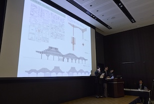 プレゼンの冒頭で「この街がもっと好きになる駅前建築物とは、異なる目的や速度、距離感を持つ人々の行為をそのまま受け止め、時に受け流すことができる存在だと考えました」と設計趣旨を伝え、敷地や周辺環境について説明。重ね梁構法による木造の大屋根を栄の駅前広場に計画し、日本建築の構造と空間のあり方を、現在の公共空間のあり方として捉え直したと発表しました。起伏を実現する構造は、東大寺南大門や醍醐寺の五重塔から着想を得たそうです。