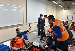 学生たちは、日本における処置対応の流れをエジプトの救急救命士らに説明。気管挿管においては経験豊富なエジプトの救急救命士の手技の素早さに、学生たちが驚く場面もありました。また、今回はインドネシアから研修に訪れている医師も参加していたことから、医師の目線からのアドバイスをもらうこともできました。エジプトの救急救命士にとっては日本の処置対応の流れを実践的に学ぶ機会となり、学生たちにとっては、経験豊富な救急救命士や医師から多くの学びが得られる時間となりました。