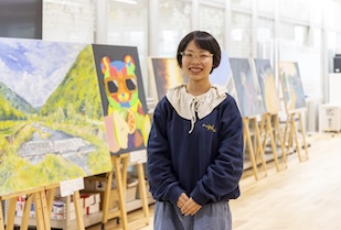 山本ゼミでは図工や美術について幅広く学び、私たち自身も表現者として作品づくりを楽しむ貴重な経験ができました。卒業制作では、毎日のように通った思い出深い校舎の景色を油絵で描きました。もう訪れる機会が少なくなるだろうと思い、この場所を絵に残して思い出せるようにしたいと考えたからです。作品には、ここで出会った大切な友達への感謝の気持ちも込めています。私は1つの作品を完成させるまでに時間がかかる方なので、完成までに約半年かかりました。最後の1週間は図工室に通いつめ、1日中こもって作業する日もありました。卒業論文と制作に追われる忙しい日々でしたが、ゼミ生同士で励まし合って乗り切ることができました。今後はゼミで学んだことを生かし、表現することの楽しさを子どもたちに伝えられる先生になりたいと考えています。