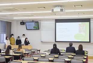 「企業分析プロジェクトB」にご協力いただいたのは、メディア事業と総合広告代理事業を展開する株式会社中広様です。2026年1月16日に行われた最終報告会では、学生5〜6人で構成された4チームが、それぞれの分析結果を発表しました。当日は、取締役管理本部長の倉橋様、広報マーケティング室部長の岡本様、フリーマガジン開発部部次長の伊藤様の3名にお越しいただきました。
