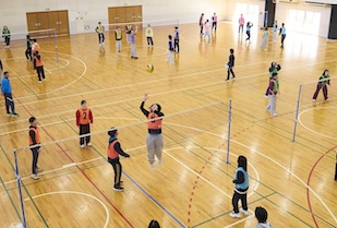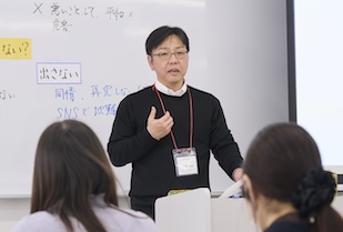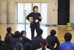 体育の講座では、体育館にて〝手でつかんでもいい〟という特別ルールのバレーボールが行われました。身体能力の差を問わず、全員がボールに触れ、ワンチームで楽しめるこの工夫は、教育現場での多様性への配慮そのものです。後半の講義では、体育教員の多くが「スポーツが得意な層」であることを指摘した上で、「スポーツが苦手な子にこそ、何を学んでほしいかを考えてほしい」という問いが投げかけられました。体育の楽しさは「する」だけでなく「見る・支える・知る」という多面的な関わりにあること。生涯にわたって心身の健康を保持し、豊かなスポーツライフを実現するための資質を育むという体育教育の本質的な目的を、学生たちは自身の経験を越えて深く刻み込んでいました。