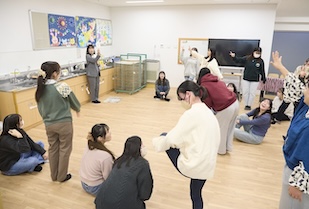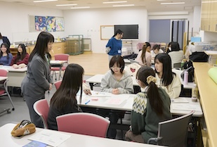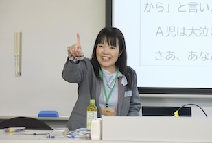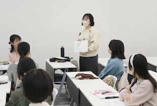 幼稚園の講座では、保育現場でも活用できるジャンケン遊びを体験したり、4人1組のグループワークで、3歳児クラスの「ある幼稚園の1日」を追体験したりしました。グループワークでは、幼稚園の1日のスケジュールが共有され、時間帯ごとに起こり得る課題について、どのように対応するかを考えました。例えば、片付けの時間になっても「恐竜を作りたい」とブロック遊びをやめない子どもへの対応では、保育者は「集団の規律」と「子どもが熱中する気持ち」の間で葛藤する場面に直面します。園児にどのような言葉をかけるべきか、学生たちは真剣に考え、意見を出し合いました。発表では、「次の活動への期待感を高める声かけ」や「作品を認め、形に残す工夫」など、保育者ならではの視点が次々と挙げられました。講座の最後には、「どの子も大好き」とという根底の愛、そして保育者自身が心に余裕を持つためのワークライフバランスについての助言もありました。理想論だけではない、プロとしての責任感と愛情にあふれた保育の在り方を学ぶことができました。