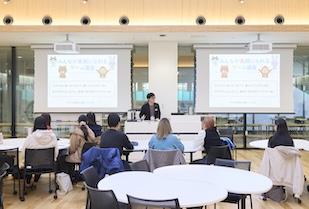 小学校の講座では、「主体的な道徳科授業づくり講座」「みんなが笑顔になれるゲーム講座」「1人1台端末を活用した授業づくり講座」の3つのテーマで講義が行われました。道徳科の授業づくりでは、授業で目指すことや目標、成立要件などについて学びます。道徳科は知識を教える授業ではないため、ゴールが見えにくいと感じることもあります。学生たちは、道徳科が子どもたちの成長にとって重要な役割を担う授業であること、そして授業づくりにどのような工夫が求められるのかを理解しました。ICT活用の講義では、1人1台端末(タブレット)を効果的に活用した授業の事例が紹介されました。授業風景を収めた動画からは、子どもたちが楽しそうに学ぶ様子が伝わり、学校現場にICTが定着しつつあることがうかがえます。その後、学生自身もタブレットを使ったワークを体験しました。櫻井先生が講義の中で強調されたのは、「ICTを使うこと自体を目的にするのではなく、子どもが自発的に学び、考えを深めるための『ツール』として活用する」という考え方です。タブレットを通して意見を共有し合う子どもたちの姿を想定しながら、操作スキルの習得だけではなく、子どもたちが「もっと知りたい」「もっと考えたい」と感じられる授業づくりについて学ぶ貴重な機会となりました。