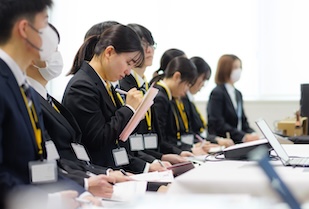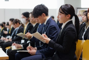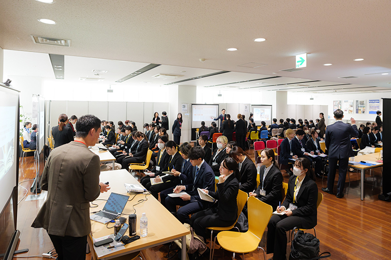 セミナーは1回30分の入れ替え制で行われ、学生たちは限られた時間の中で複数のブースを回り、会社概要や具体的な業務内容、仕事のやりがい、教育制度などについて、人事担当者の説明に熱心に耳を傾けました。