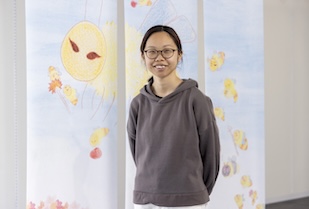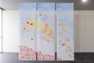 以前、学科の展示を手伝った際に、天井から作品を吊るす展示スタイルが強く印象に残っており、「自分でもやってみたい」と思ったことが、今回の企画につながりました。これまで壁に貼る展示しか経験がなかったため、天井から空間を使うことで、色が広がっていくような感覚を表現できたと感じています。紙の種類や展示に必要な部材など、何をどうすればよいのか分からないところからのスタートでしたが、先生方からアドバイスをいただき、新たな手法に挑戦することで多くの学びがありました。次にこのような機会があれば、コンセプトや文章をより深く落とし込み、自分の表現をさらに磨いていきたいです。
