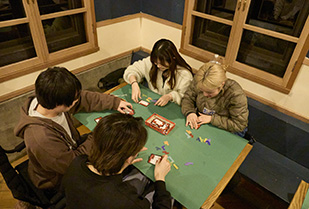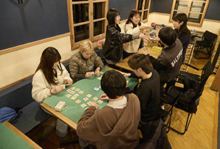 宿泊先の「アウトドアビレッジ373」へ到着したあと、鍋を全員で囲み、和気あいあいとした夕食の時間を過ごしました。夕食後は、郡上市出身のボードゲームファシリテーター、チョモランマ山下さんを迎え、さまざまボードゲームを体験しました。ボードゲームファシリテーターの役割は、その場・その人に合ったゲームをチョイスし、体験してもらうこと。虫食い文字の問題文を読んで答えを素早いアクションで当てる「ナゼカヨメチャウ」や、記憶力を試す自己紹介クイズゲーム「佐藤です。好きなおにぎりの具は梅です。」でウォーミングアップ。そのあとは、ボードの枠にピースをはめる「ウボンゴ」、9つのタイルの絵柄を揃える「ナインタイル」、カードの塔を積み上げるバランスゲーム「キャプテン・リノ」の各ゲームでチームの総得点数を競うなど、チョモランマ山下さんが提案するさまざまなボードゲームで盛り上がりました。学生は教員をめざす立場として、ボードゲームが単なる娯楽ではなく、ルールを守ることや、他者と協力する社会性の育成、思考力・判断力の向上など、子どもの視点に立って理解を深められる実践的な学びのツールであることを感じられたようです。