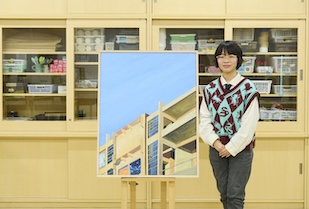 大学生活の思い出を形にしたく、長久手キャンパスの風景を描きました。制作過程で山本先生とディスカッションし、表現したいことを引き出してもらうことができました。こだわったのは光と影の描写です。柱に影を落として光が差し込んでいるように見せました。校舎の壁に実際にはない窓を付け、窓の外には通学途中に見ていた車窓の景色を描きました。夕焼けがキレイな日もあれば、日が暮れて藍色の空が広がる日もあり、柱と柱、光と影の交差、大学で出会った同窓生との交わりを“交錯”という言葉に込め、その交わりをたたえる気持ちで、「交錯に祝杯を」という作品名にしました。卒業後は、子どもたちの表現力を育むという教育方針に共感した9年一貫の義務教育学校の教員になります。子どもたちと制作活動をするのが今から楽しみです。