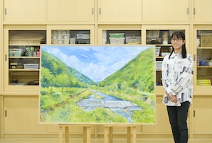 尾瀬の玄関口となる福島県の小さな村「檜枝岐(ひのえまた)」の夏の景色を題材にしました。昨年夏に豊田市美術館で開催されていたモネ展へ行き、モネの睡蓮の繊細な色彩表現に感化されて、私も自然の風景を多彩な色使いで描いてみたいと思いました。雲は白だけなく赤や黄色を使って、山の緑は赤、青、黄色の3色を重ねて描きました。豊かな水の流れは、白色を大胆に使ってうまく表現できたと思います。制作期間は2ヶ月ほど。途中、山本先生がポジティブな声かけをしてくださるので、モチベーションを上げて取り組むことができました。私は卒業後、特別支援学校の教員として働きます。言葉で自己表現するのが難しい子でも、図工や美術を通して表現する楽しさを育んでいけるような指導ができたらと思っています。