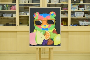 本来、パンダは白黒ですが、常識や固定観念にとらわれず、自分らしく人生をカラフルに彩っていく姿を表現しました。サングラス姿は、「自分の世界を楽しむ強さ」の象徴です。周囲に描いたフルーツは、日々の出会いや経験を表しています。