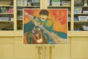 戦争によって多くの命の火が消えても、想いは消えず、受け継がれていく――。その強さを表現しました。炎の中を進む姿には、未来へ想いをつないでいく力を重ねています。制作では、アクリル絵の具の上からクレヨンを重ねることで、質感と色の奥行きを追求しました。肌には青を用い、馬の毛も多彩な色で描くことで、自分の感覚を自由に表現しています。