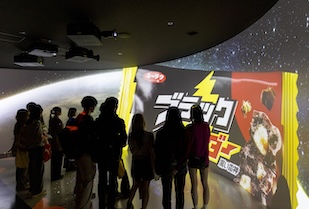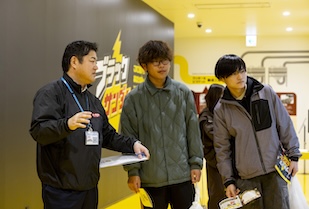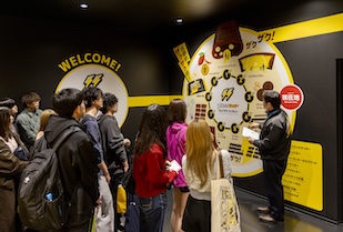 4チームに分かれて行われた工場見学では、テーマパークのように趣向を凝らした見学エリアに学生たちは目を輝かせていました。 見学エリアに入ると巨大スクリーンのアニメーション映像が目の前に広がり、迫力ある演出に学生たちからは感嘆の声が!さらに奥に進み、実際に稼働する製造ラインを見学。緻密に計算されたオートメーションにより、次々とブラックサンダーが形作られていく様子は圧巻でした。また、見学を通じて紹介されたのが、有楽製菓が取り組む「スマイルカカオプロジェクト」です。児童労働撤廃に取り組むサステナブルなカカオ原料への切り替えを100%達成など、1つの商品を通じて世界平和に貢献する姿勢を学び、食を扱う者としての倫理観を学びました。