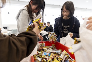 さらに社員食堂では、お楽しみの「ブラックサンダーつかみ取り大会」も開催されました。期間限定フレーバーなど、多彩なラインナップのブラックサンダーを前に、学生たちは嬉々として挑戦。平均15〜20個の戦利品を手にすると、満面の笑みでお土産を持ち帰りました。