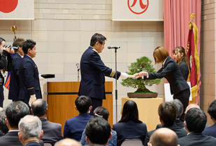 式典では、災害現場功労者の代表として伊藤さんと杉本さんが登壇。名古屋市の河村たかし市長から感謝状が手渡されるとともに、「ありがとうございます。ご苦労様でした」と労いの言葉がかけられました。その様子を救急救命学専攻の小野木堂人先生が付き添い人として見守り、学生たちの勇敢な行動にあらためて熱い拍手を送りました。