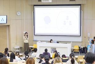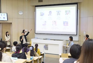 今回は、キャリアワークショップなどを展開しているNPO法人「育Qひろば」のみなさんをお招きしました。月の半分を正社員として働くパラレルワーカー、フリーランス助産師、夫婦で時短勤務、二児と主夫を扶養する商社ウーマン、土木女子など、メンバーの働き方はさまざま。学生たちはキャリアの分岐点などの話を興味深く聞き入っていました。