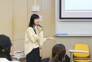 育Qひろばのメンバーで創造表現学部の前身であるメディアプロデュース学部OGのもえさんは、自動車部品メーカーに入社して12年目。入社後のエピソードだけでなく、本学での経験や学びについても語ってくださいました。メディアリテラシーの授業で培った「いろいろな視点から想像して考えること」は多くの場面でも活きているそうです。「様々な人とコミュニケーションを取る際には、情報だけを受け取るのではなく、本当にそうなのかな?という視点を持ち、自分の目で見るなど事象を確認し、自分が納得した上で行動することにしています」と熱く語る姿が印象的でした。