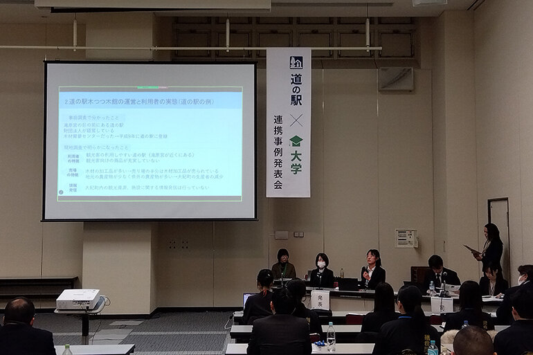 このたび、3月6日(金)に東京で開催された国土交通省主催「第2回 道の駅×大学連携事例報告会」において、調査成果の報告依頼を受けました。当日は、前島ゼミ4年生2名が代表として登壇し、三重県大紀町で実施した調査の成果の一部を発表しました。