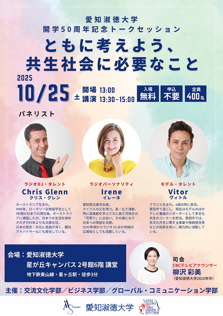 2025年10月25日(土)に愛知淑徳大学星が丘キャンパスで、愛知淑徳大学開学50周年事業として、星が丘キャンパスの3学部(交流文化学部/ビジネス学部/グローバル・コミュニケーション学部)主催のトークセッション「ともに考えよう、共生社会に必要なこと」を開催いたします。