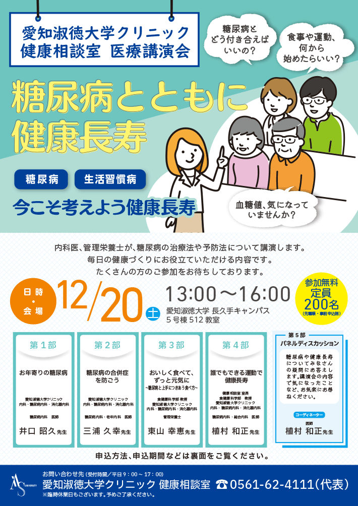 2025年12月20日(土)に長久手キャンパスで、愛知淑徳大学クリニック 健康相談室主催 医療講演会「糖尿病とともに健康長寿」を開催いたします。