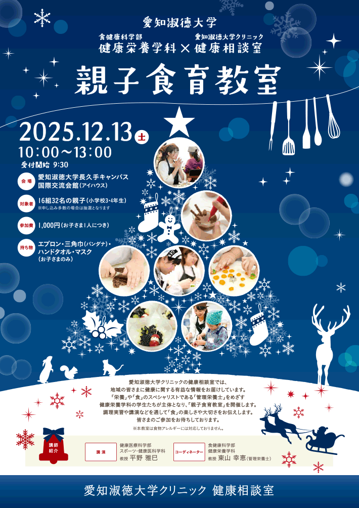 2025年12月13日(土)長久手キャンパスで、健康栄養学科と健康相談室共催の親子食育教室「にこにこ♪ クリスマスごはんでカルシウムをチャージ!」を開催いたします。