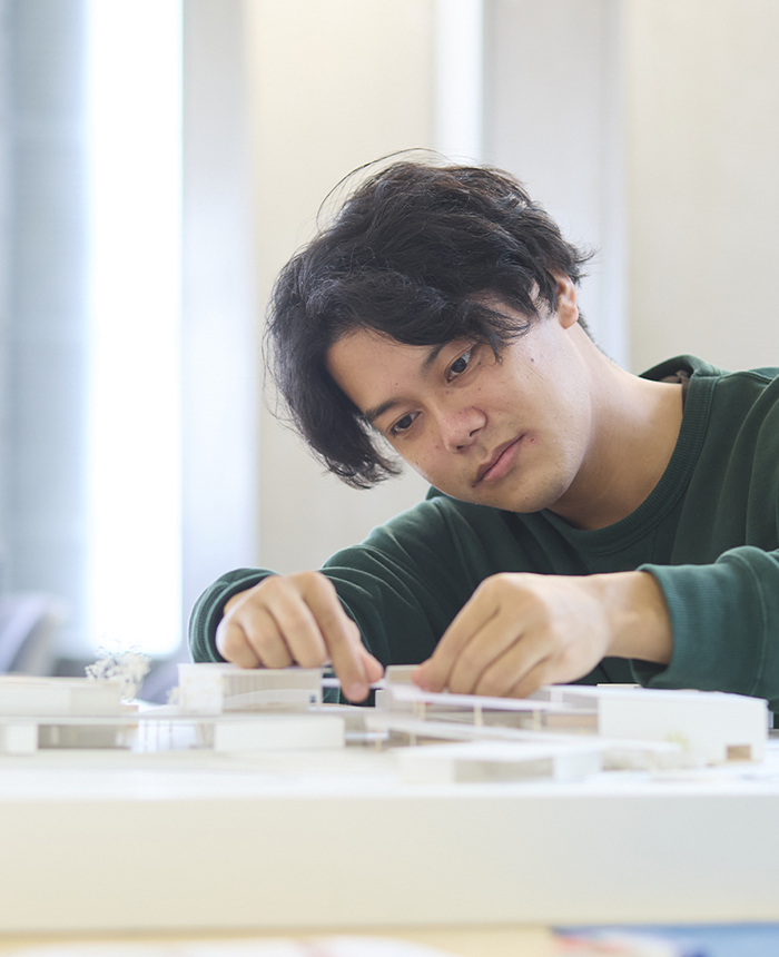 仲間と協働してひとつのプロジェクトを完成させる経験を積むことが自分自身の成長に大きく影響しました。デザインワークショップやゼミでのグループコンペなど仲間と共同で制作をした経験を通じて、ひとつの建築には多くの人々の想いが詰まっていることを実感しました。卒業後は、住宅メーカーの設計士として働きます。在学中に培った力を活かして施主の方やご家族の想いに寄り添い、笑顔を生む家づくりをめざしたいです。* 創造表現学部 創造表現学科 建築・インテリアデザイン専攻を改組し、建築学部 建築学科を2025年4月開設