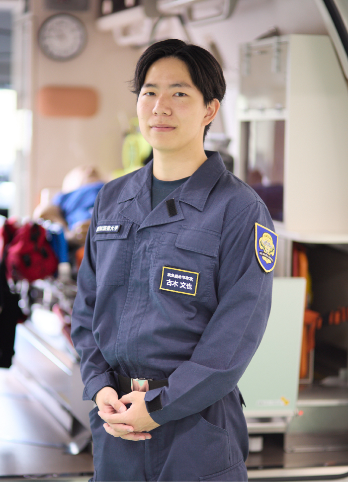1年次から4年次まで毎週おこなわれる学内実習に繰り返し取り組むうちに、新しい知識を取り入れながらつながりを意識して学び続ける姿勢が最も大切だと気づきました。卒業後は、名古屋市消防局に入職します。学外実習の経験で自分の考え方や視野が大きく変わったと感じたことから、現場に出て経験することすべてが自分自身の成長につながると思います。最善を尽くすためにはどうすべきか、常に考えながら行動し、救急救命士としてチーム医療の一員として貢献できるよう自己研鑽を続けていきたいです。また、自分自身が搬送された経験や大学での学びを通して、「傷病者やその家族に寄り添う気持ち」を忘れずに持ち続け、搬送する傷病者の不安や、その家族の気持ちまでくみ取りながら、救急活動の場面ごとに考え行動できる救急救命士として、地域に貢献していきたいです。