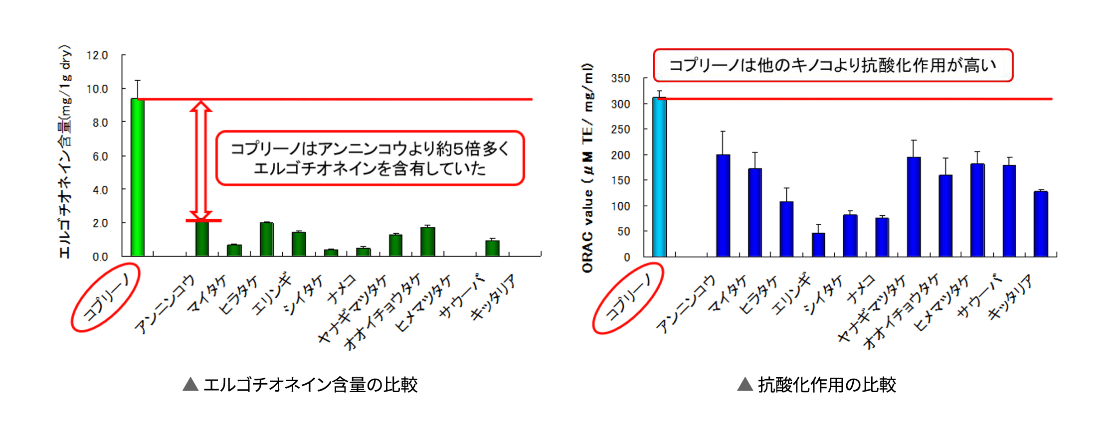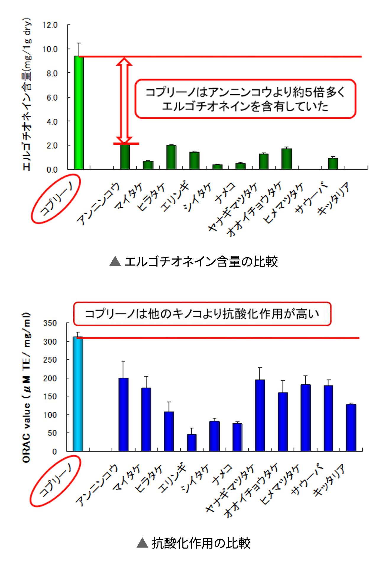 菅野教授らの研究グループは、このコプリーノが他のキノコと比べ約5倍以上のエルゴチオネインを含有し(下図:左)(下図:上)、強い抗酸化作用を示すことを突き止めた(下図:右)(下図:下)。