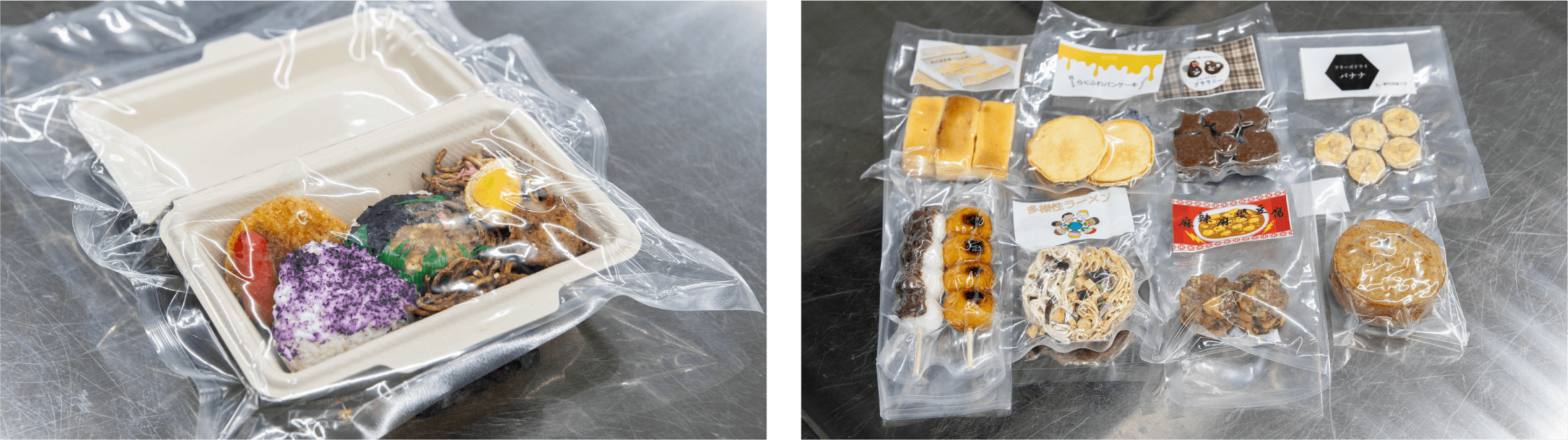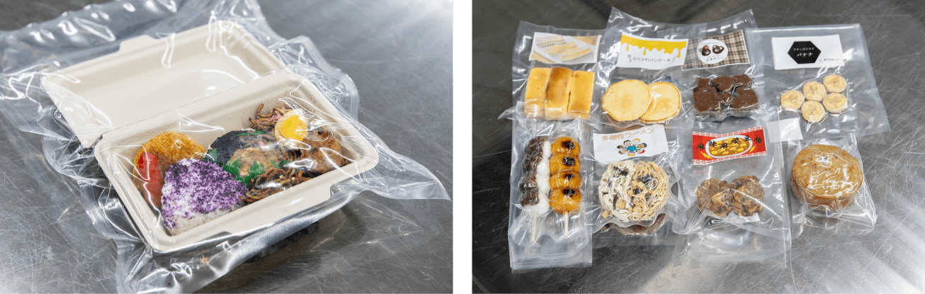 学生がつくったフリーズドライ食品を見ると、そのままの姿を生かしたコンビニ弁当や団子、調味を工夫したコンパクトな形状のラーメンや麻婆豆腐、などユニークで柔軟なアイデアを感じられる。