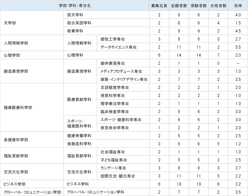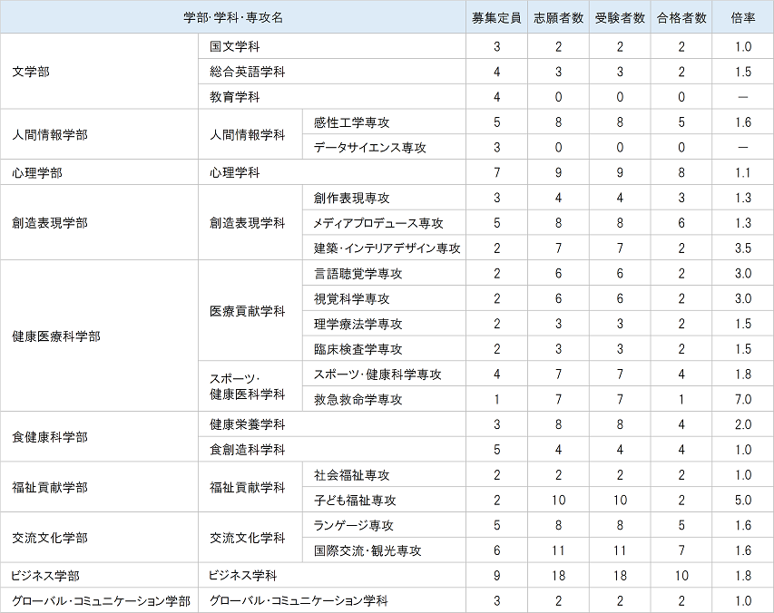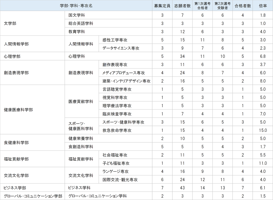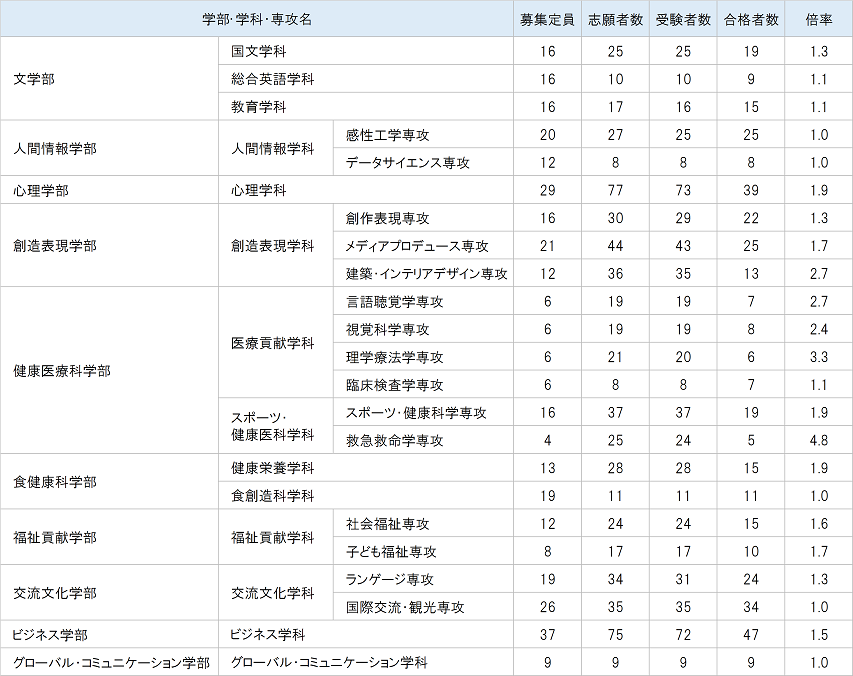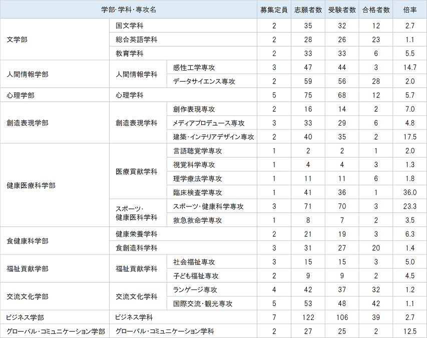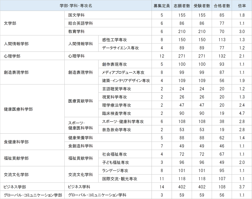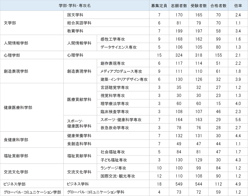 愛知淑徳大学の過去の入試結果を掲載しています。各年度の学部別の募集定員、志願者数、倍率、合格者数をご確認いただけます。