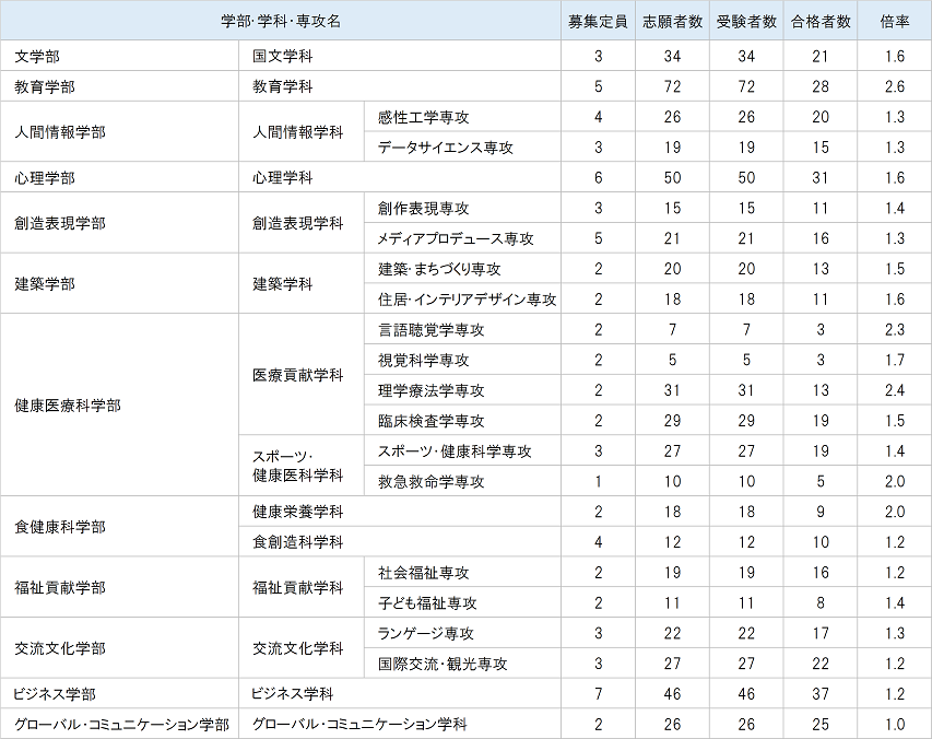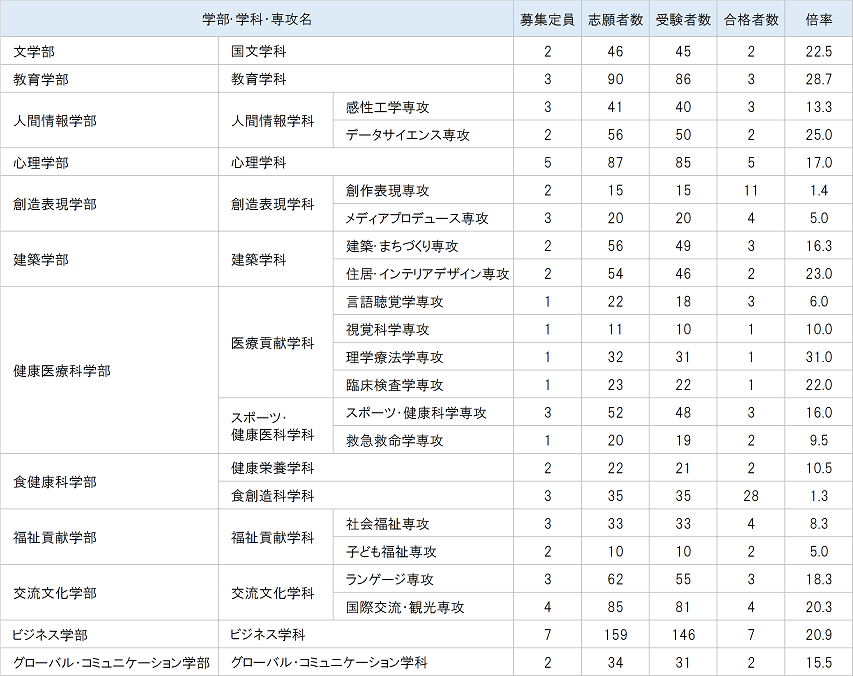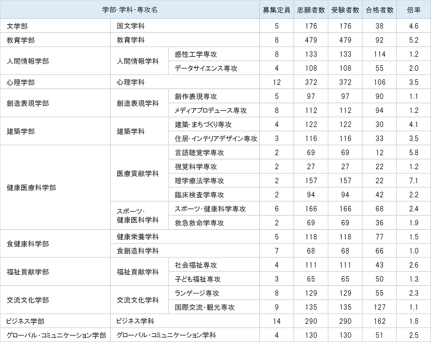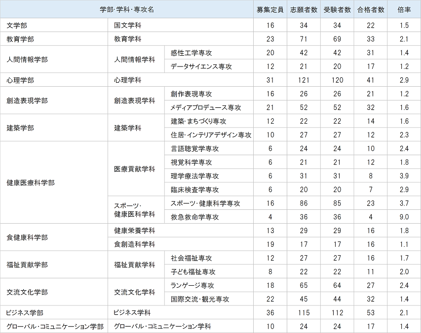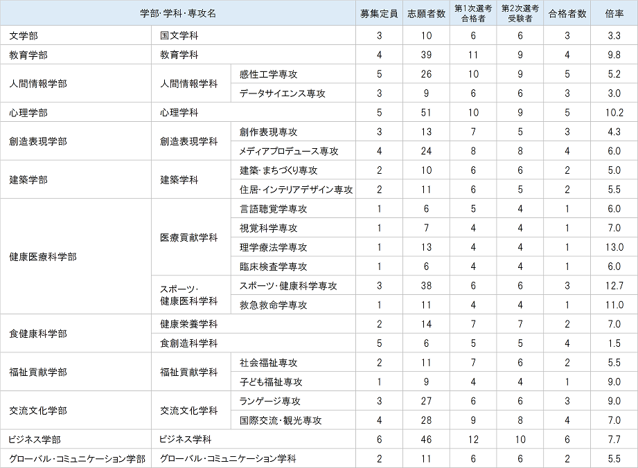 愛知淑徳大学の過去の入試結果を掲載しています。各年度の学部別の募集定員、志願者数、倍率、合格者数をご確認いただけます。